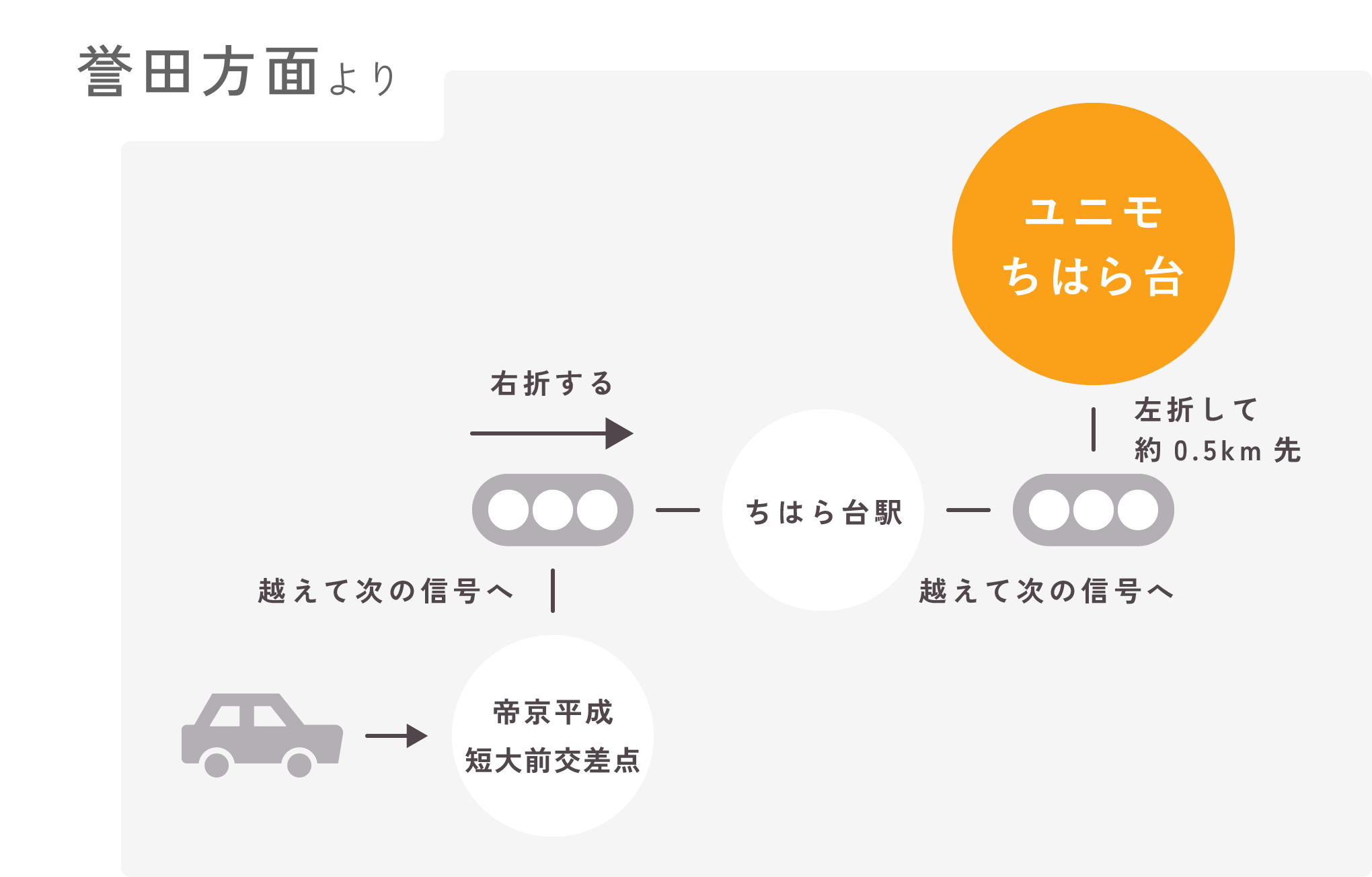 ちはら台駅を南方向(瓦窯通り方面)へ進み、左折して入庫してください。