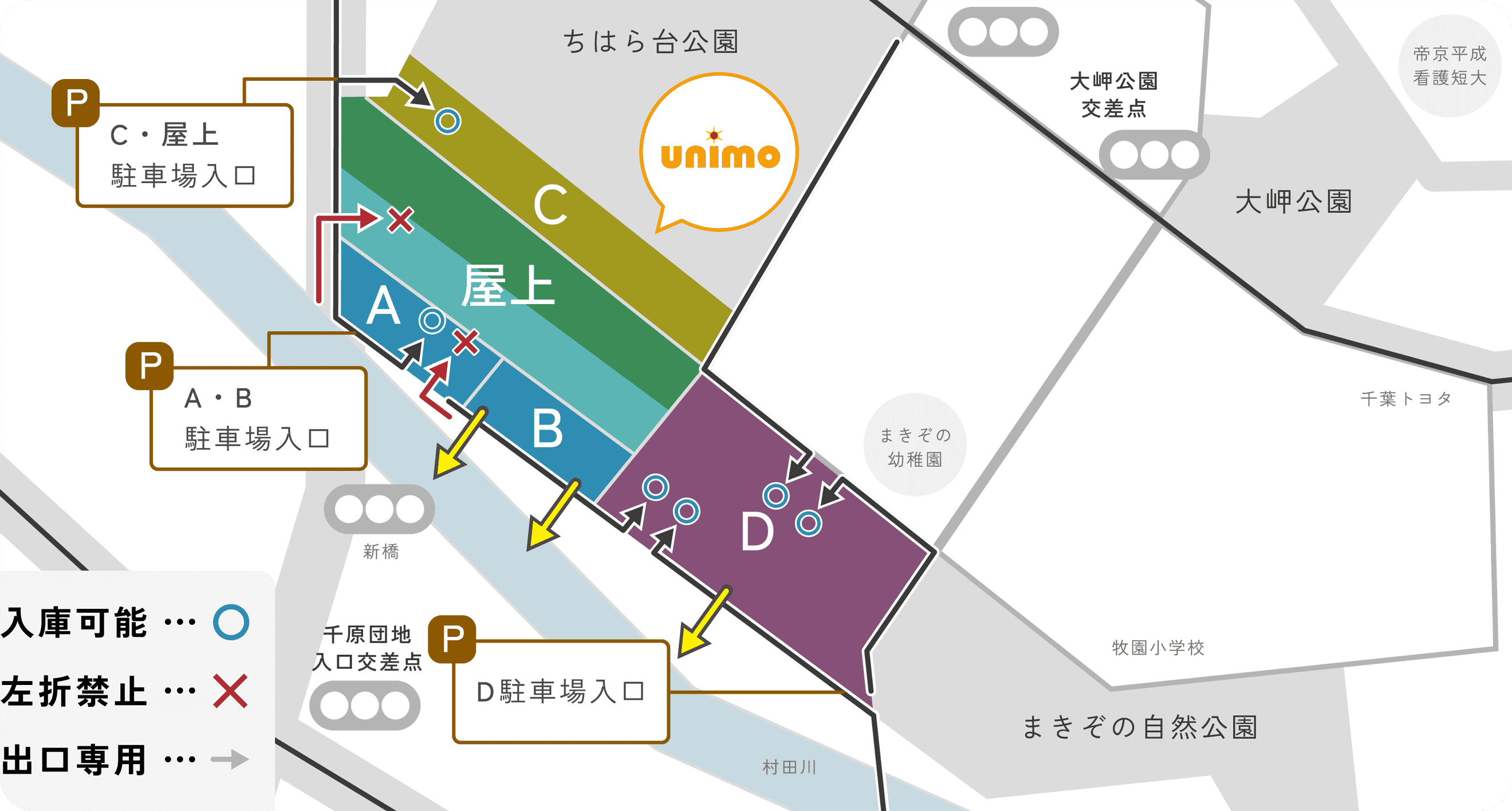(A駐車場、B駐車場の出口からは入庫できません。)