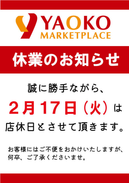 【ヤオコー】店休日 日程2/17(火) 時間終日 場所1F ヤオコー 1F ヤオコーは、2/17(火)に限り店休日とさせていただきます。 ご不便をおかけいたしますが、何卒ご了承ください。 なお、2/18(水)以降より通常営業いたします。