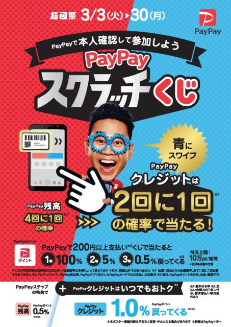 【超PayPay祭】PayPayスクラッチくじ 日程3/3(火)~3/30(月) PayPayまたはPayPayカードで200円以上支払い くじで当たると 1等:100% 2等:5% 3等:0.5% PayPayポイント戻ってくる! 付与上限:10万ポイント/買いおよび期間(対象店舗合算) 詳しくはコチラ⇒