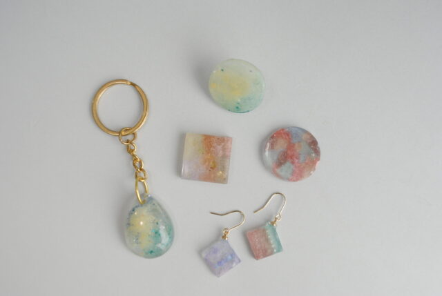 流行りのニュアンスカラーを使ってオリジナルのレジンアクセサリー3点セット【ブローチ・キーチャーム・ピアス(イヤリング)】をつくります。上品でかわいいアクセサリーを手作りします。
