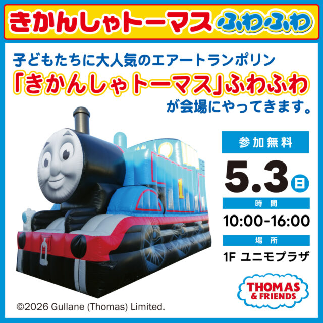 子どもたちに大人気のエアートランポリン「きかんしゃトーマス」ふわふわが会場にやってきます。