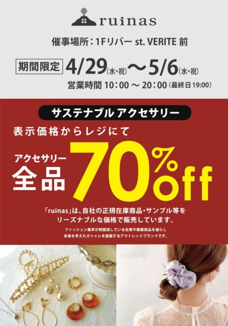 ruinas GW限定出店! 日程4/29(水祝)~5/6(水祝) 時間10:00-20:00(※最終日は19:00まで) 場所1F VERITE前 ruinasがGW期間限定でユニモに登場! 全品70%OFFの超お買い得! この期間に是非ユニモちはら台にお越しください。 場所:1F VERITE前 日程:4/29(水祝)~5/6(水祝) 時間:10:00-20:00(※最終日は19:00まで) ruinasについて詳しくはコチラ⇒