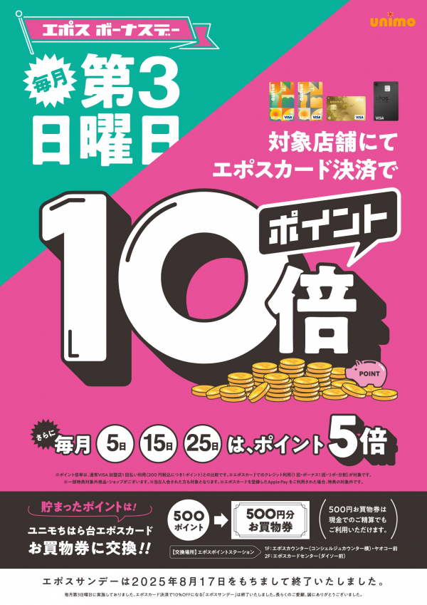 ※15日が第3日曜日の場合、ポイント10倍を適用する。※ポイント倍率は、通常VISA加盟店1回払い利用(200円税込につき1ポイント)との比較です。※エポスカードでのクレジット利用(1回・ボーナス1回・リボ・分割)が対象です。※一部特典対象外商品・ショップがございます。※当日入会された方も対象となります。※エポスカードを登録したApple Payをご利用された場合、特典の対象外です。