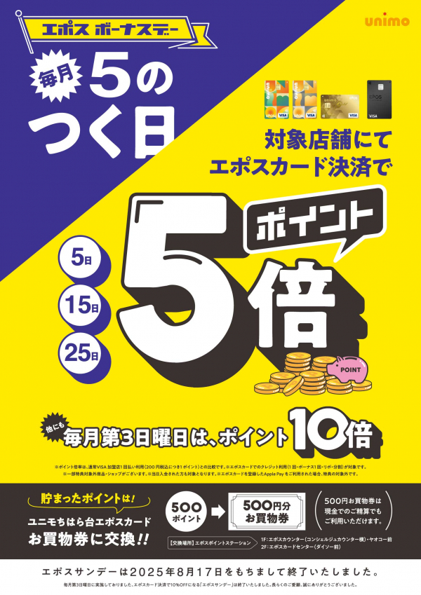 対象店舗にてエポスカード決済いただくと、ポイント5倍