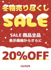GUNZE グンゼ/ ファッション・ファッショングッズ 2F MAP163 ショップページへ ■冬物売り尽くしSALE 2026.02.14 更新 SALE価格から更に20%OFF! まだまだ寒い日が続きます。 すぐ使える、次の冬支度に ぜひグンゼショップへお立ち寄りください。