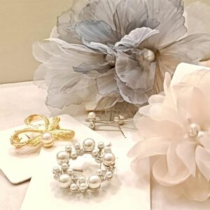 ブローチ、コサージュは身に着けることにより、顔周りが明るく華やかな印象に。