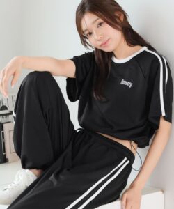 サイドラインがアクセントの半袖トップス×ワイドパンツのセットアップです🖤