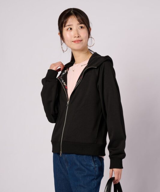 シンプルながら、前側に振った脇線や首元の高さにこだわり、女性らしいバランスに仕上げたフードZIPパーカー