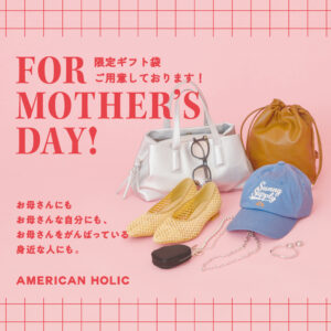 AMERICAN HOLIC アメリカンホリック/ ファッション・ファッショングッズ 1F MAP67 ショップページへ アメホリ10周年大感謝祭❣ 2026.04.29 更新 こんにちはAMERICANHOLICです🎶 !!アメホリ10周年大感謝祭!! 日頃のご愛顧に感謝を込めて、お得なアイテムを多数ご用意♪ 大感謝祭だけの特別価格アイテムもお見逃しなく! あの人気アイテムも今だけさらにお買得に!? ぜひ、お気軽にお立ち寄りください🌟 みるだけ、手に取るだけ、ご試着だけでも✨ 🎁母の日のラッピングも、限定ギフト袋ご用意ございます🎁 1階AMERICANHOLICでお待ちしております❦