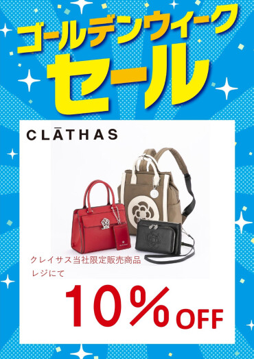 【ゴールデンウィークセール開催中】特別企画③当社限定商品のクレイサスバッグがレジにて10%OFF!!