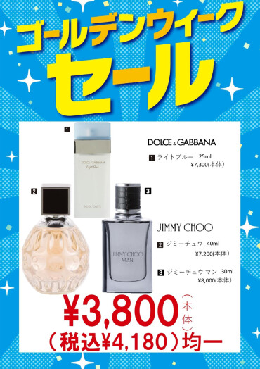 【ゴールデンウィークセール開催中】特別企画⑦人気香水が一部税込4,180円!!