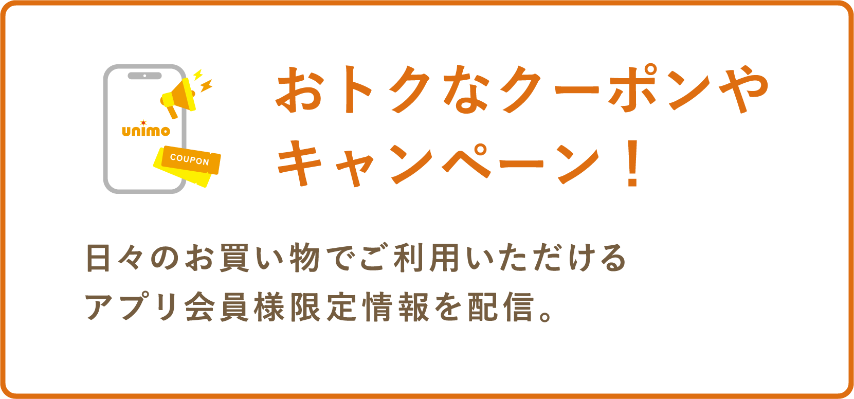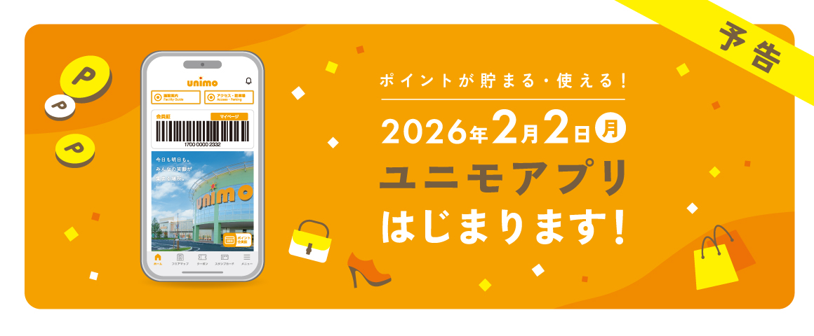 ユニモアプリ対象の店舗お買上100円(税込)につき1ポイントが付与され、次回のお買物から1ポイント=1円としてお使い頂けます。
