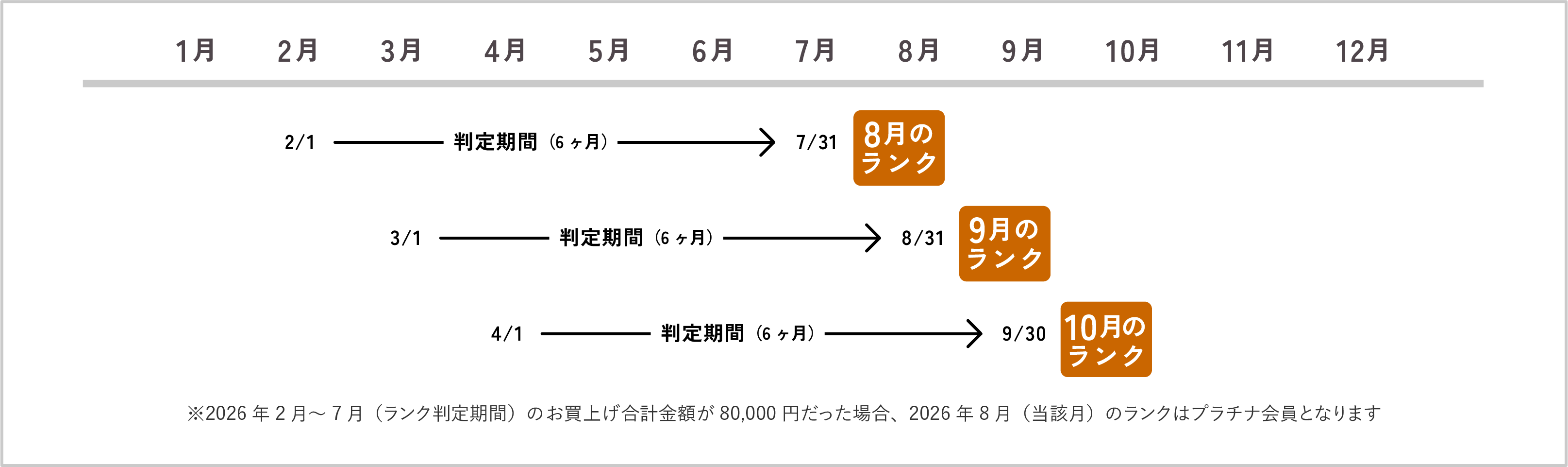 当該月前月までの6ヶ月間の対象店舗でのお買上げ合計金額に応じて、毎月ランクが決まります。