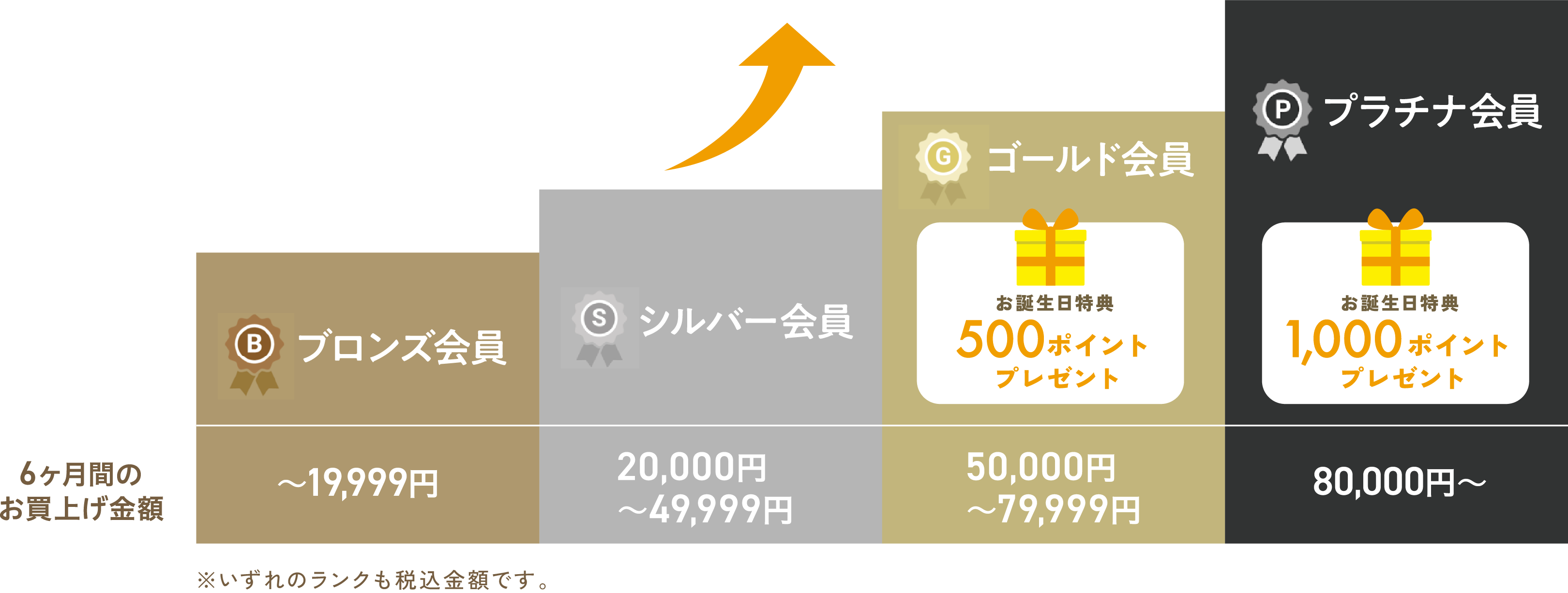 | 6ヶ月間の お買上げ金額 | 〜19,999円 | 20,000円 〜49,999円 | 50,000円 〜79,999円 | 80,000円〜 |